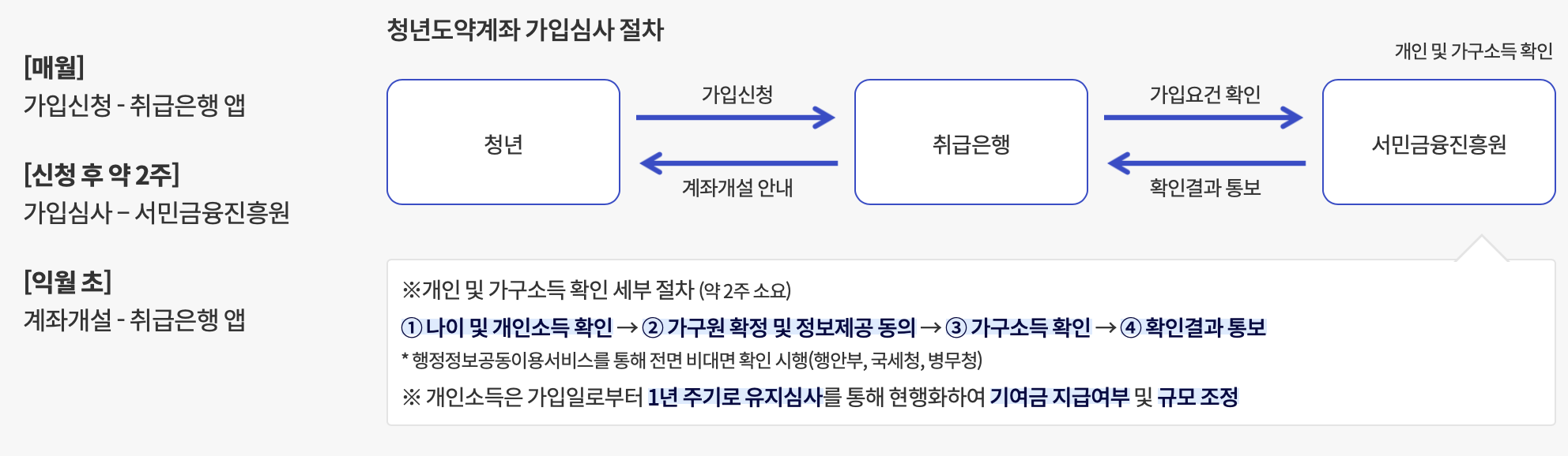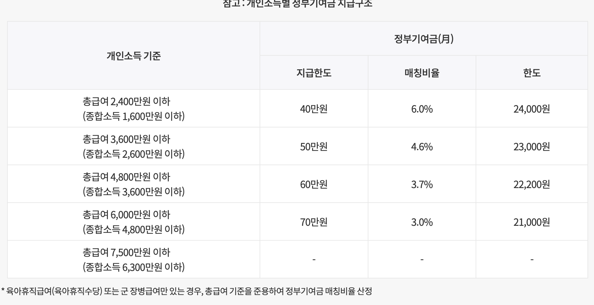 청년의 중장기 자산형성 지원을 위한 정책형 금융상품으로 만기5년 동안 매월 70만 원 한도 내에서 납입하면 매월 최대 6%의 정부기여금을 지급하고 이자 소득에 대한 비과세 혜택을 제공하는 상품